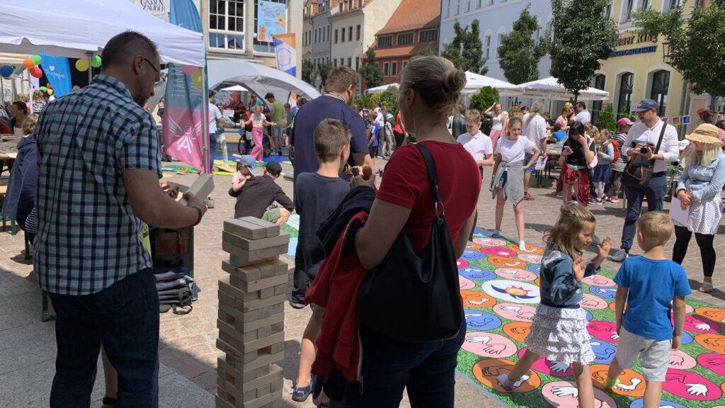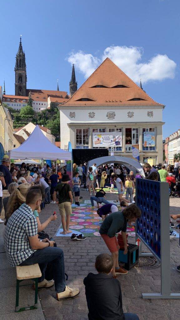 Bei herrlichstem Wetter war auch das soziokulturelle Zentrum „Hafenstraße“ e.V. im Rahmen der Verleihung des Kinderkunstpreises Sachsen unter dem Motto „Hört mal her“ Mit dem Spiel Mobile und seinen Großspielen mit dabei.