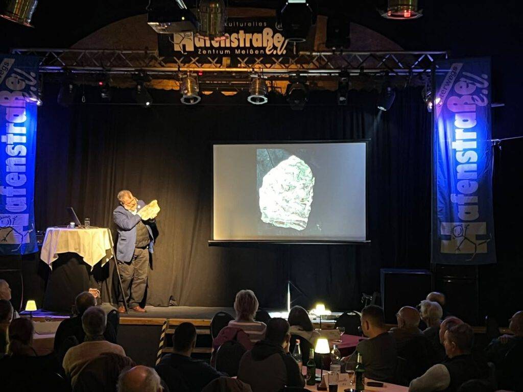 Mit lebhaften Erzählungen und beeindruckenden Bildern enthüllte er die geologischen Geheimnisse des Meißner Untergrundes. Die Vielfalt der Gesteine, Erze und sogar Edelmetalle faszinierte die zahlreichen Gäste, die gebannt zuhörten und sich von Sickmanns Fachwissen und Leidenschaft mitreißen liessen.