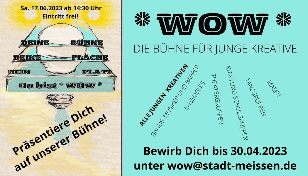 „WOW“ ist ein neues Format für junge und kreative Menschen in und um Meißen. Es wird initiiert vom Kulturamt der Stadt, dem soziokulturellen Zentrum „Hafenstraße“ e.V., dem Atelier.Hof und dem Theater Meißen. Eine Initiative im Rahmen von „K² – Kulturnetzwerke in Kommunen“.
