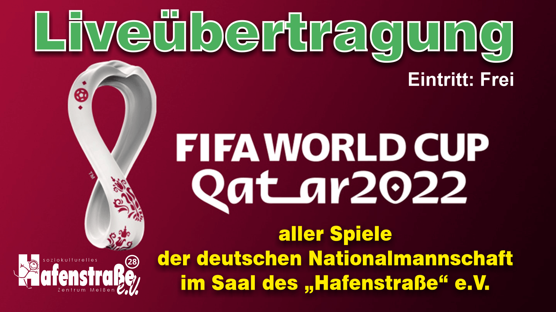 FIFA WORLDCAP Qatar 2022 Übertragung aller Spiele der deutschen Nationalmannschaft im Saal des „Hafenstraße“ e.V.