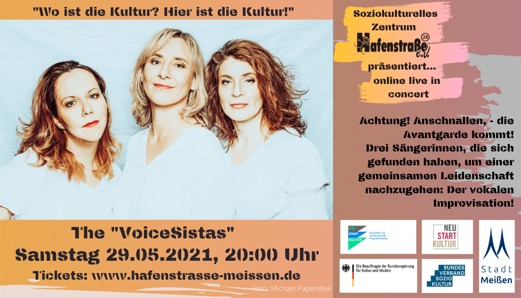 „VoiceSistas“Achtung! Anschnallen, – die Avantgarde kommt!Samstag, 29.05.2021, um 20:00 Uhr, online Konzert.Drei Profisängerinnen beglücken uns mit der großen Kunst der Improvisation. Infos/Veranstalter: