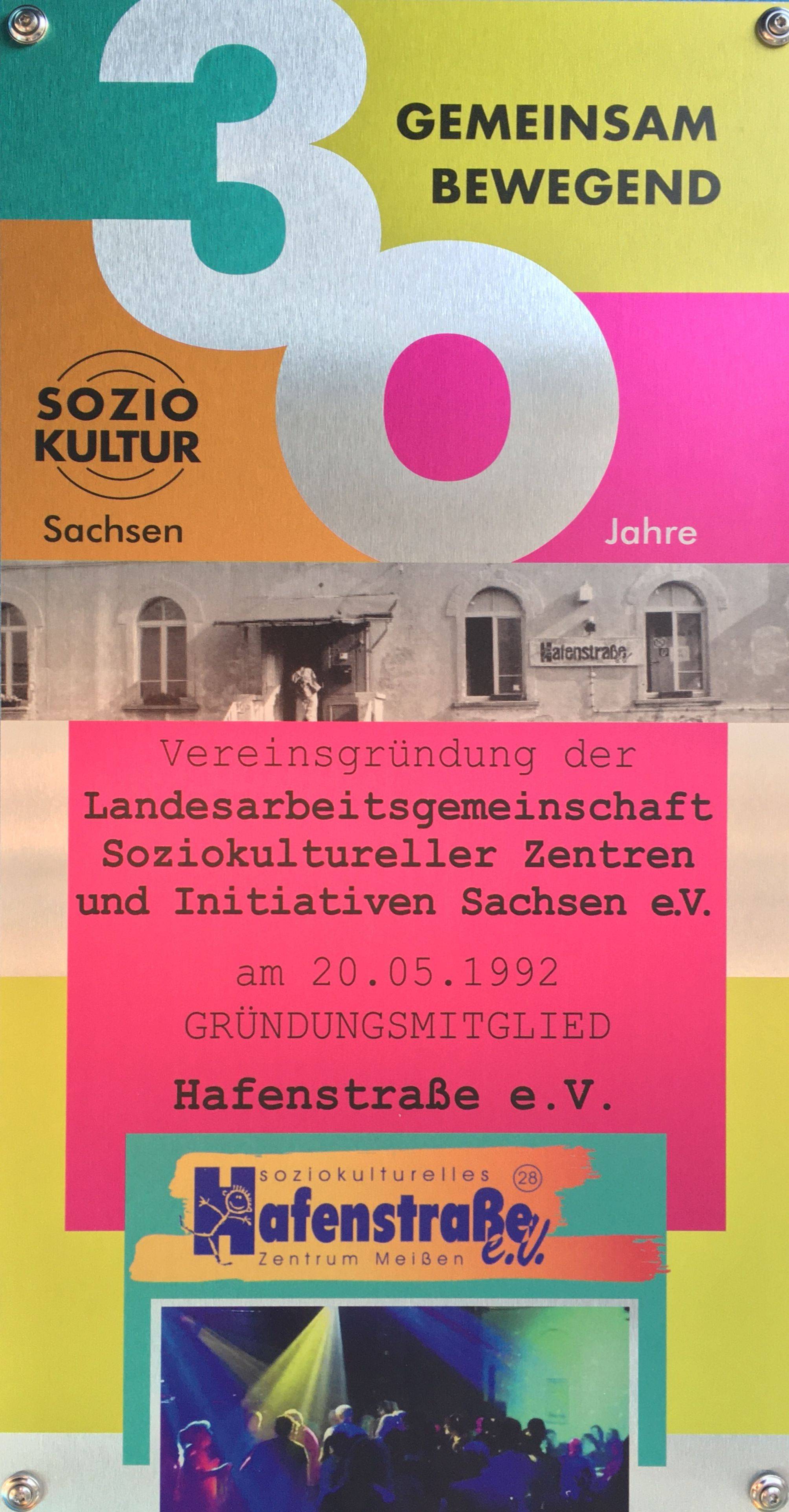 Anlässlich einer Festveranstaltung zum 30. Jahrestag der Gründung des Landesverbandes Soziokultur Sachsen wurde auch das Soziokulturelle Zentrum „Hafenstraße“ e.V. Meißen ausgezeichnet.
