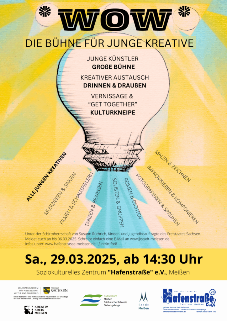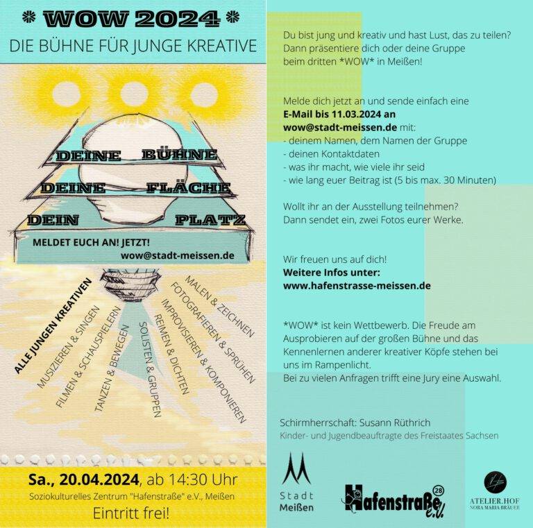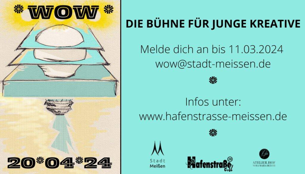 Austauschen, Ausprobieren, Auftreten – Auf geht’s in Runde Nummer drei mit unserem Format für den kreativen Nachwuchs in und um Meißen. Auch im dritten *WOW*-Jahr bereiten Stadt Meißen, „Hafenstraße“ e.V. und Atelier.Hof Kindern und Jugendlichen aller Altersgruppen wieder die Möglichkeit, ihr Können auf der großen Bühne zu zeigen. Der Countdown für die Bewerbungsfrist läuft ab sofort.